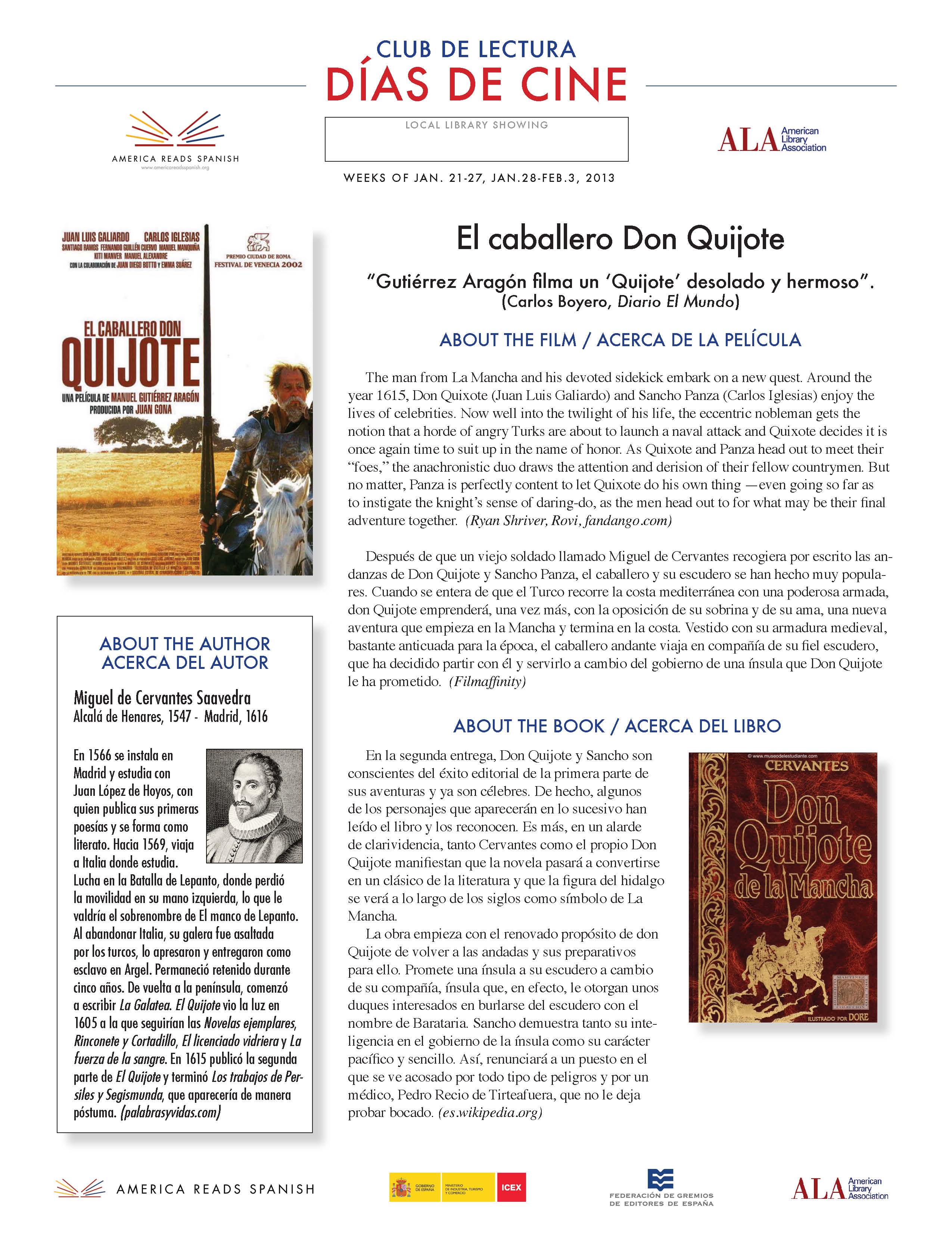 The movie, based on Miguel de Cervantes Saavedra's "El ingenioso hidalgo Don Quijote de la Mancha" (second part of "Don Quijote de la Mancha"), will be available at Días de Cine Reading Club until February 3rd, 2013. This initiative is sponsored by the America Reads Spanish program and the American Library Association to promote literature and the Spanish language in American libraries and universities.