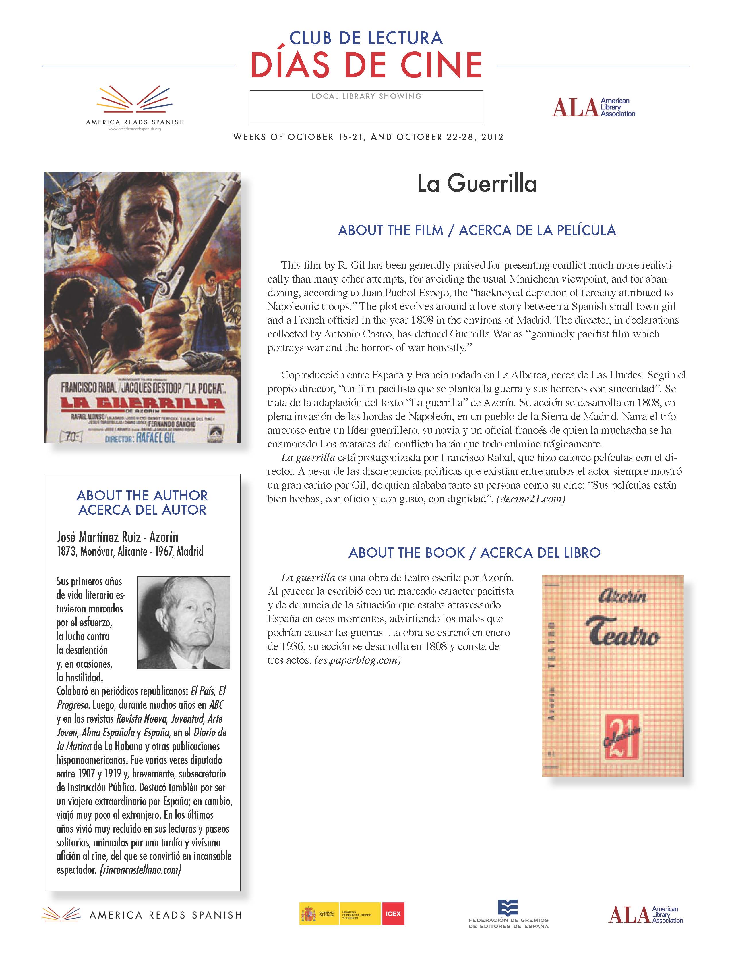 The movie, based on José Martínez Ruiz – Azorín's play is featured at the Días de Cine Reading Club until October 28th. This initiative is sponsored by the America Reads Spanish program and the American Library Association to promote literature and the Spanish language in American libraries and universities.