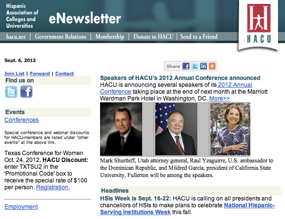 The Hispanic Association of Colleges and Universities latest newsletter features the Speakers of the 2012 Annual Conference, plus news, events and much more.