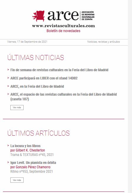 The Asociación de Revistas Culturales de España is ( Association of Cultural Magazines of Spain (ARCE), is based in Madrid and includes 84 Spanish cultural magazines.