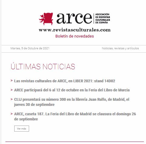 The Asociación de Revistas Culturales de España is ( Association of Cultural Magazines of Spain (ARCE), is based in Madrid and includes 84 Spanish cultural magazines. Click on the image below to view the bulletin