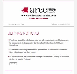 The Culture and creativity at hand in digital format. Asociación de Revistas Culturales de España (Spain's Association of Cultural Magazines) brings you a wide spectrum of cultural magazines. Click below to see ARCE's bulletin of April 3rd