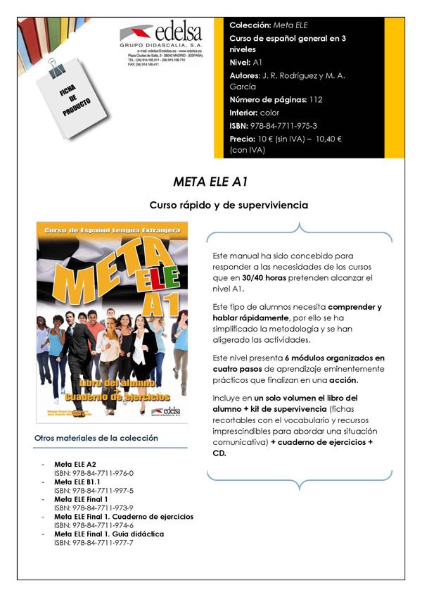 The full color text of META ELE 1 includes a kit with vocabulary flash carts and other resources.