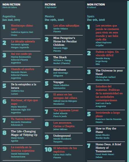 Get to know the bestsellers: Fiction and Non-fiction titles in Argentina, Mexico and Spain. Click on image to see full list www.thespanishbookstage.com