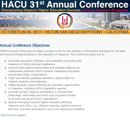 HACU’s Annual Conference will take place on October 28-30, 2017 at Hilton San Diego Bayfront, California. The conference provides a unique forum for the sharing of information and ideas for the best and most promising practices in the education of Hispanics.